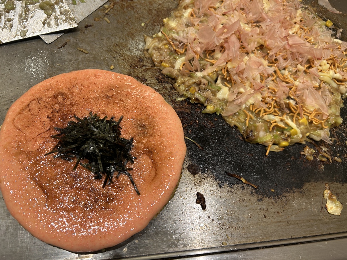 浅草でもんじゃ焼き(右)を頂きました。美味しかったです。